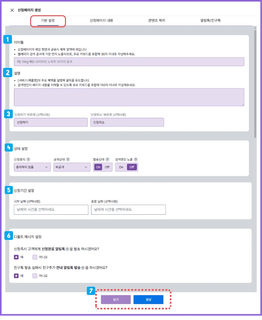 2단계: 신청페이지 > ‘기본 설정’ 탭 진입